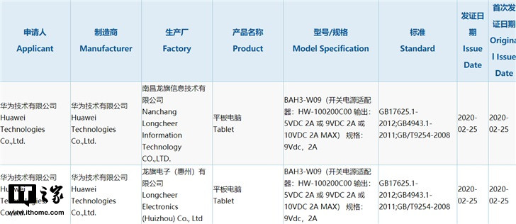。申请人为华为技术有限公司,首次发证日期为2月25日,支持18W快充。这款型号为BAH3-W09的华为